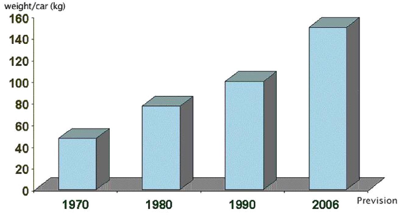 یک وسیله نقلیه متوسط از حدود 150 کیلوگرم پلاستیک و کامپوزیت های پلاستیکی در مقابل 1163 کیلوگرم آهن و فولاد استفاده می کند - در حال حاضر حدود 10 تا 15 درصد از وزن کل خودرو از پلاستیک ساخته می شود(شکل 1).