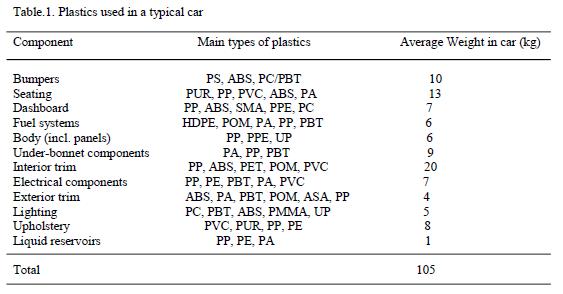 اگرچه حداکثر 13 پلیمر مختلف ممکن است در یک مدل خودرو استفاده شود (جدول 1)، تنها سه نوع پلاستیک حدود 66 درصد از کل پلاستیک های مورد استفاده در یک خودرو را تشکیل می دهند: پلی پروپیلن (32 درصد)، پلی اورتان (17 درصد) و PVC (16 درصد)